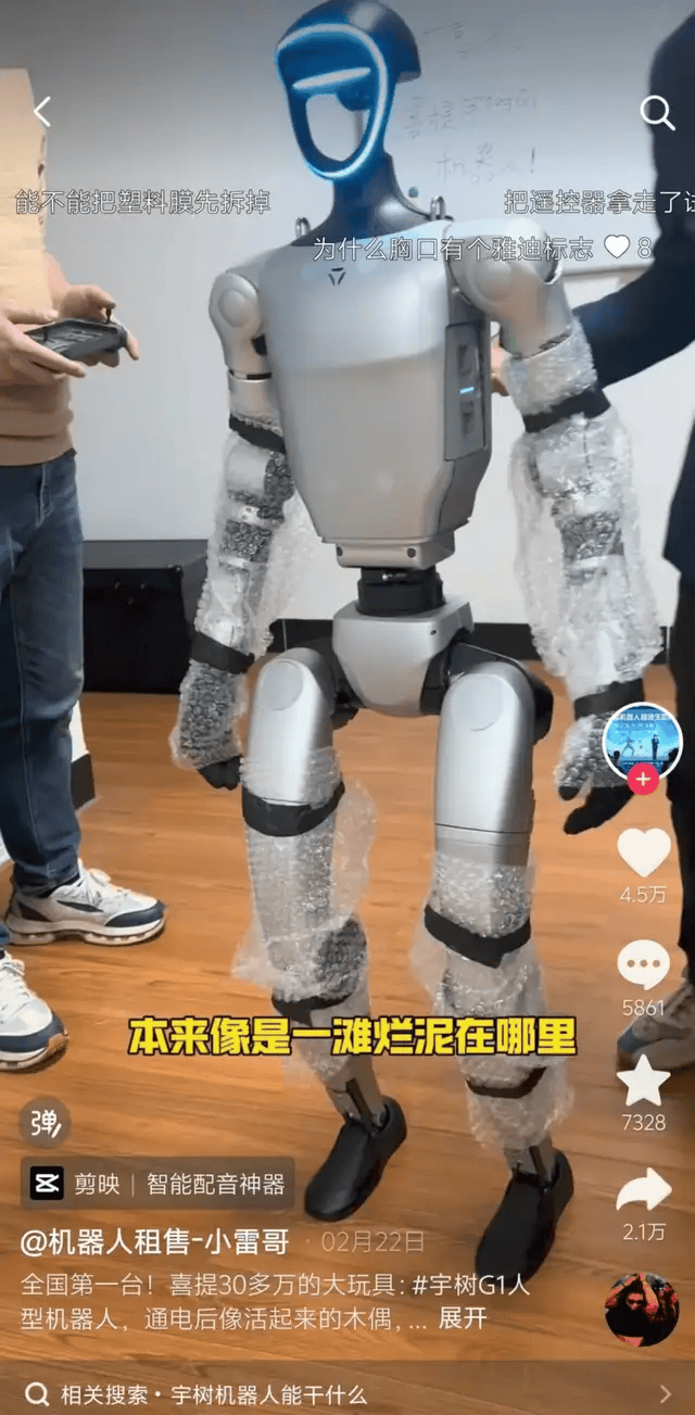 2月末,90后的小雷哥买下了人生中第一台机械人——价值30万元的高配版宇树G1。他随手拍下开箱视频:七十多斤的「铁疙瘩」竟自行坐起,「像是木偶被注入了生命,从一滩烂泥变成通了电就能行走的钢铁兵士」。